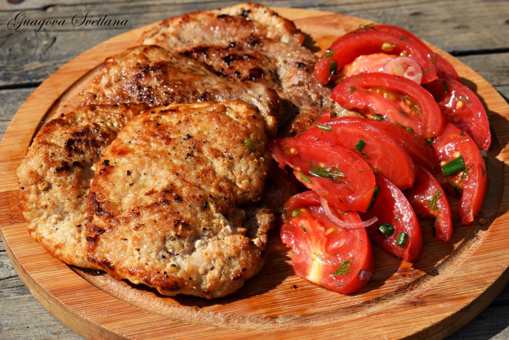 Складываем отбивные из свинины друг на друга, оставляем пропитаться и просолиться, примерно, на 20-30 минут.