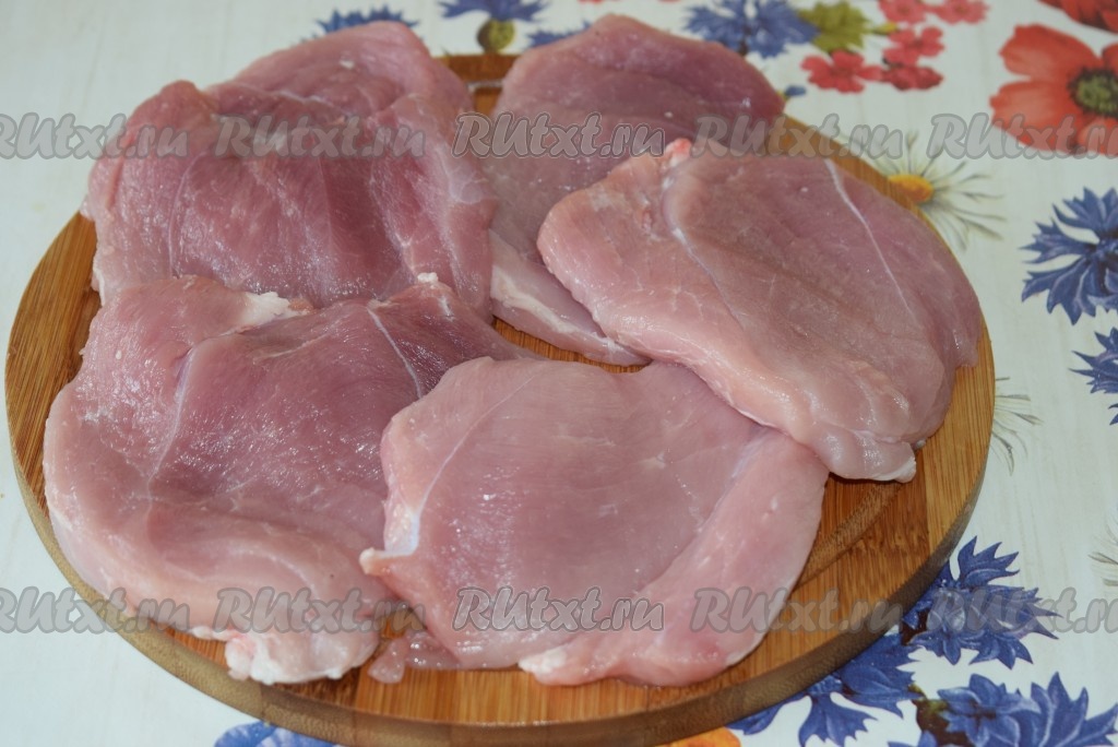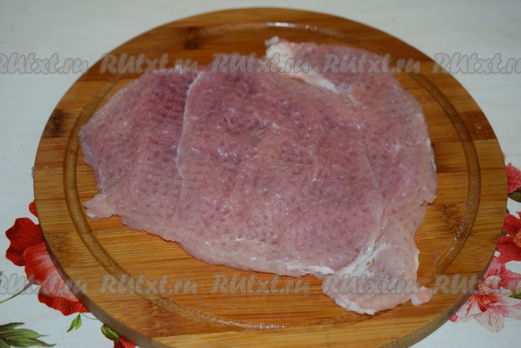 Нарезаем мякоть свинины на порционные кусочки по 1,5 см в ширину.