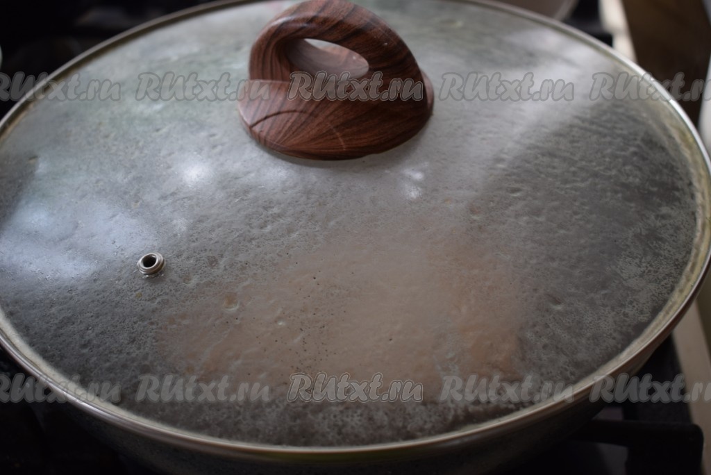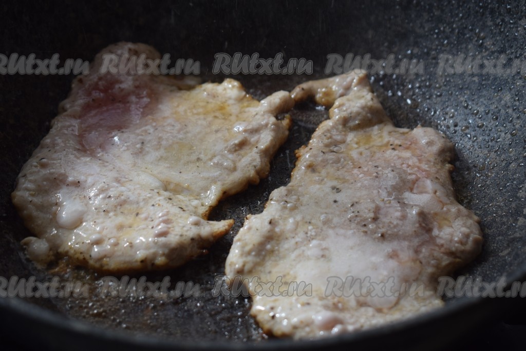 Накрываем крышкой и жарим на сильном огне с одной стороны до полного побеления мяса (примерно, 7 минут).