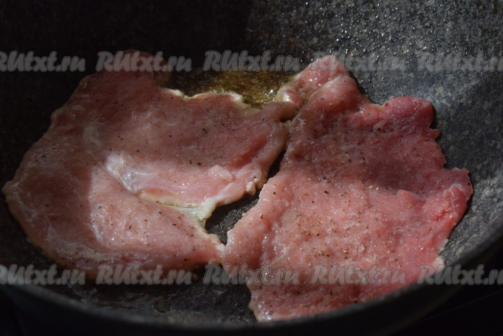 По прошествии времени разогреваем сковороду. Сковороду для этого блюда надо брать толстостенную, с крышкой. Отбивные, которые жарятся без кляра, будут брызгаться, поэтому крышка нам необходима. Наливаем в сковороду масло и кладем по две отбивные на сковороду.