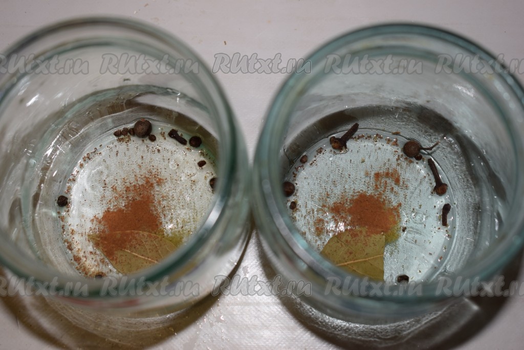 В чистые, промытые в горячей воде с содой банки выкладываем черный перец горошком, душистый перец, бутоны гвоздики, лавровые листья, корицу.