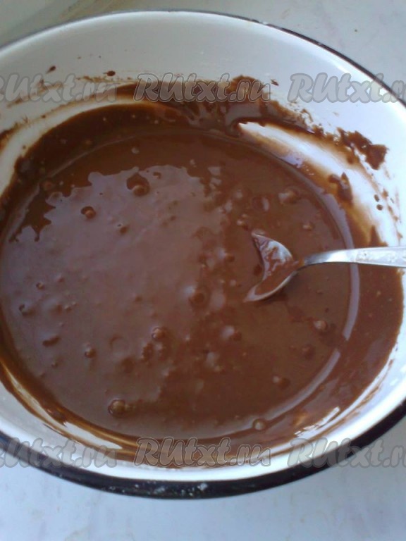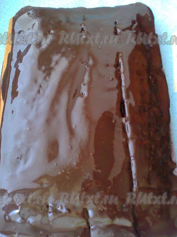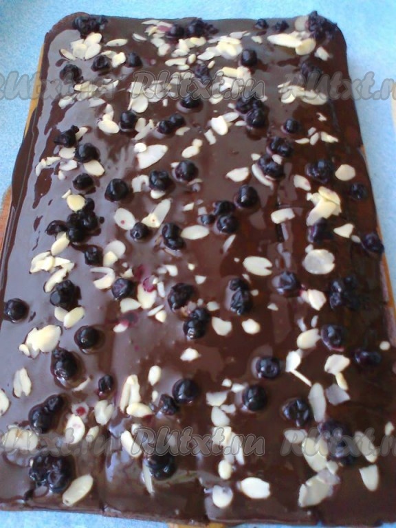 Через несколько минут полить пирог отложенным шоколадным кремом.