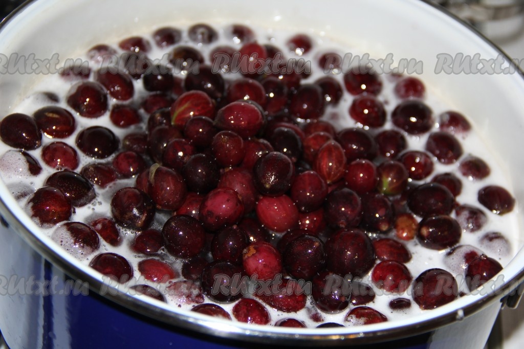 Как только сироп закипит, аккуратно добавить крыжовник в кастрюлю. Довести варенье до закипания и варить пять минут на медленном огне. Не забываем снимать пенку.