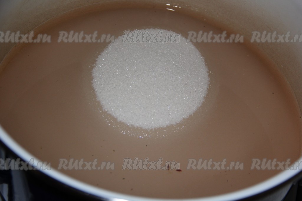 Затем жидкость, в которой были ягоды, процедить в кастрюлю, добавить сахар и поставить на огонь.