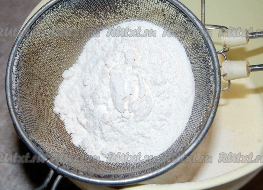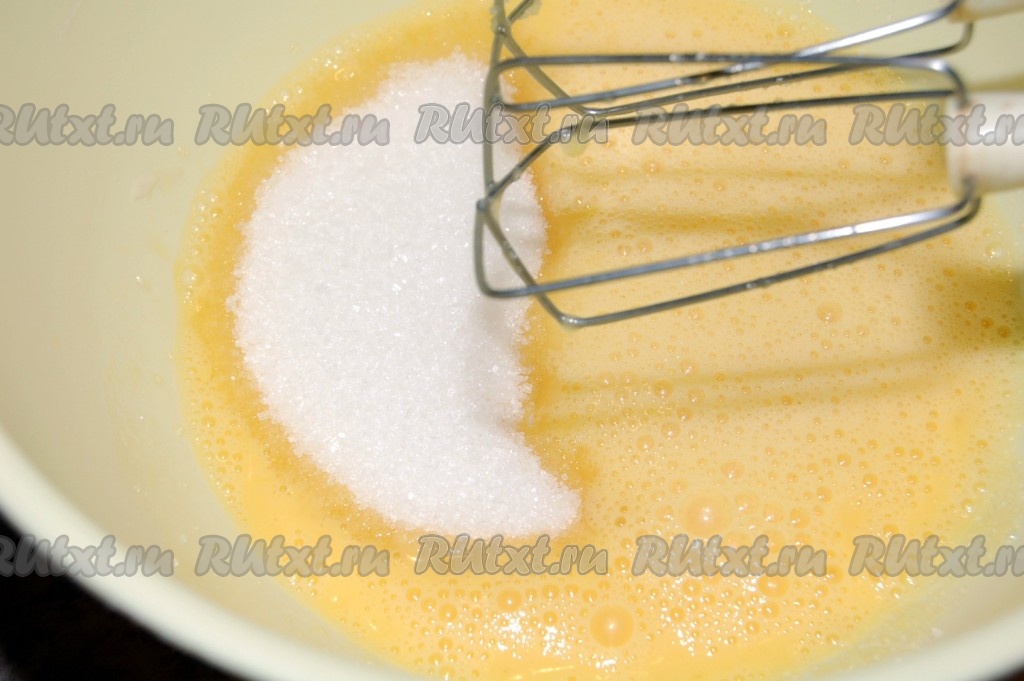 Взбивать сахар с яйцами до пышного, светлого состояния.