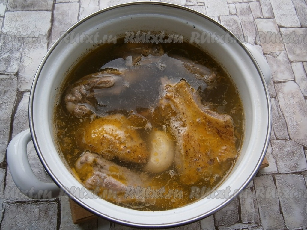 Поставить кастрюлю на огонь, довести до кипения, убрать тщательно пену. Бульон посолить, добавить в него одну очищенную луковицу и варить мясо на слабом огне под прикрытой крышкой около 1-1,5 часов.