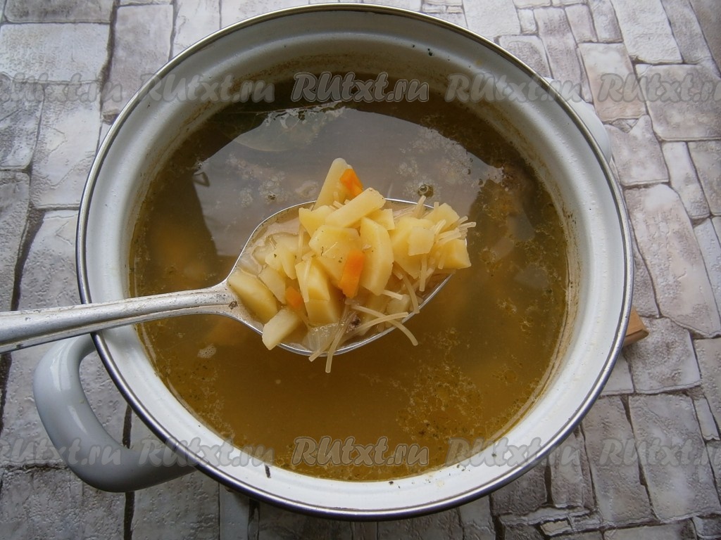 Варить овощи в бульоне на небольшом огне 25-30 минут. Затем, по желанию, всыпать чуточку сушеных трав, добавить вермишель и лавровый лист, проварить суп еще минут 5-7.
