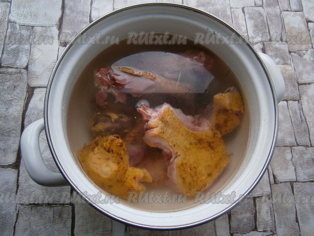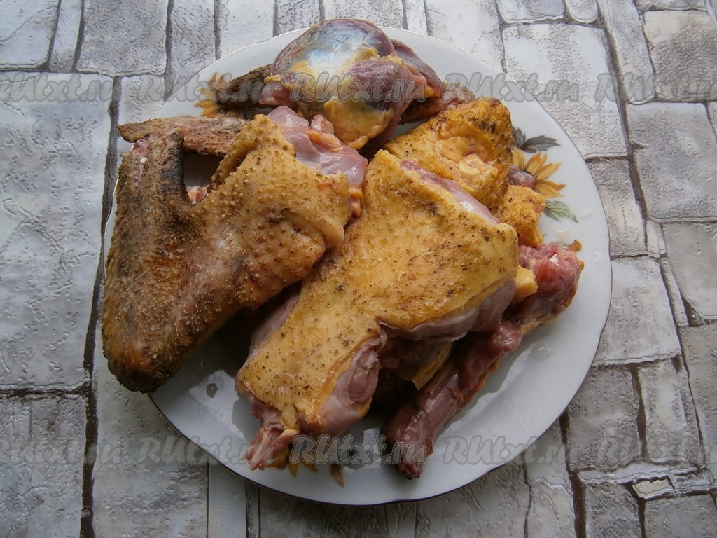 Картошку, морковь и лук очистить. Части домашней утки нужно тщательно обсмалить на огне, хорошенько вымыть.