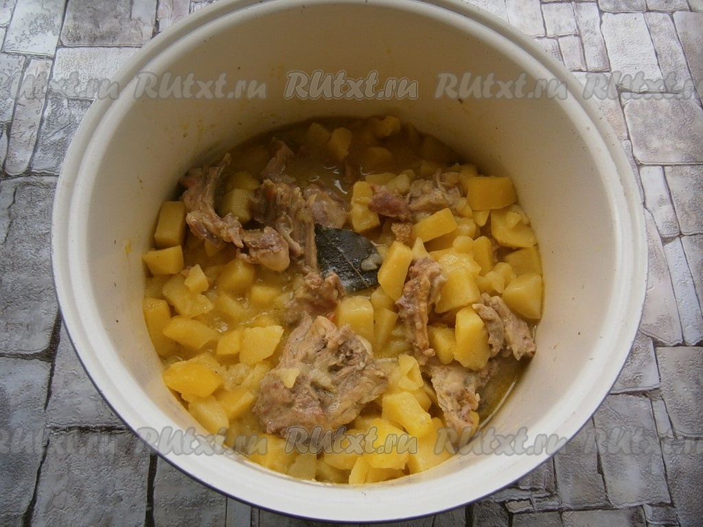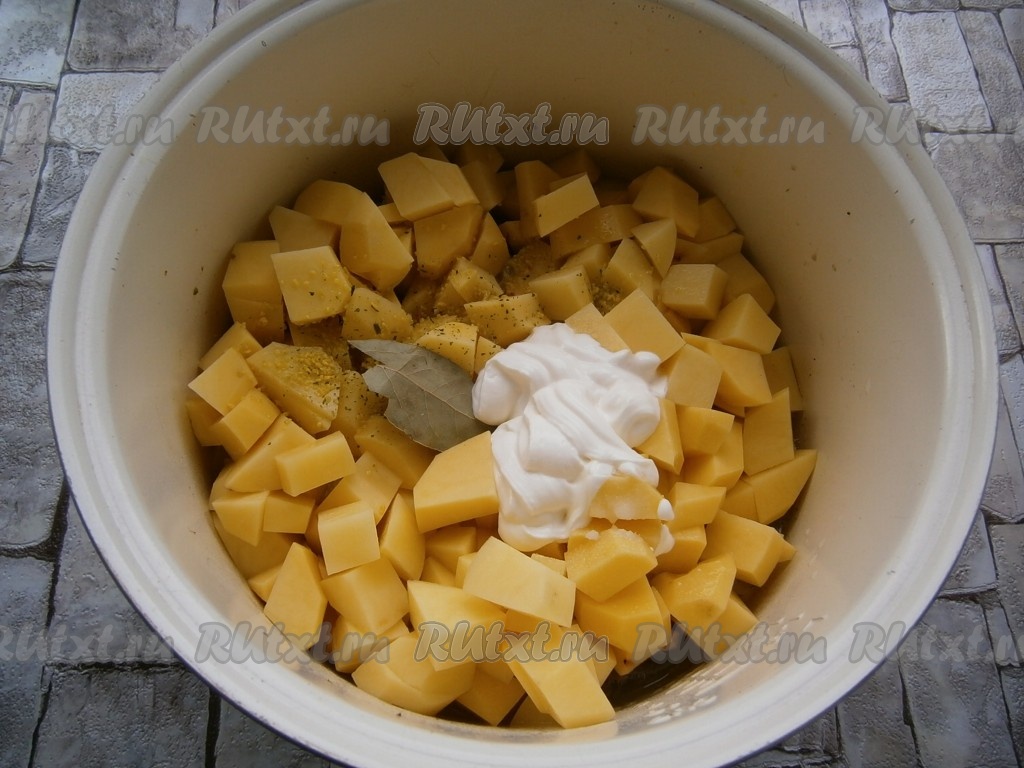 К почти готовому кролику добавить очищенный и нарезанный кубиками или кусочками картофель, сметану, лавровый лист, всыпать соль, приправу, влить 200 мл горячей воды, закрыть крышку мультиварки.
