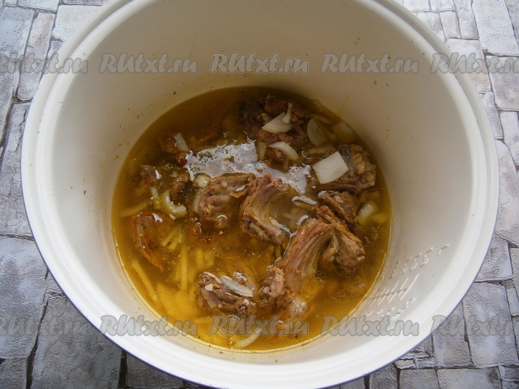 Затем добавить очищенный и нарезанный кусочками репчатый лук, перемешать и обжаривать далее оставшееся время, иногда помешивая. После окончания программы влить в чашу 300 мл горячей подсоленной воды.