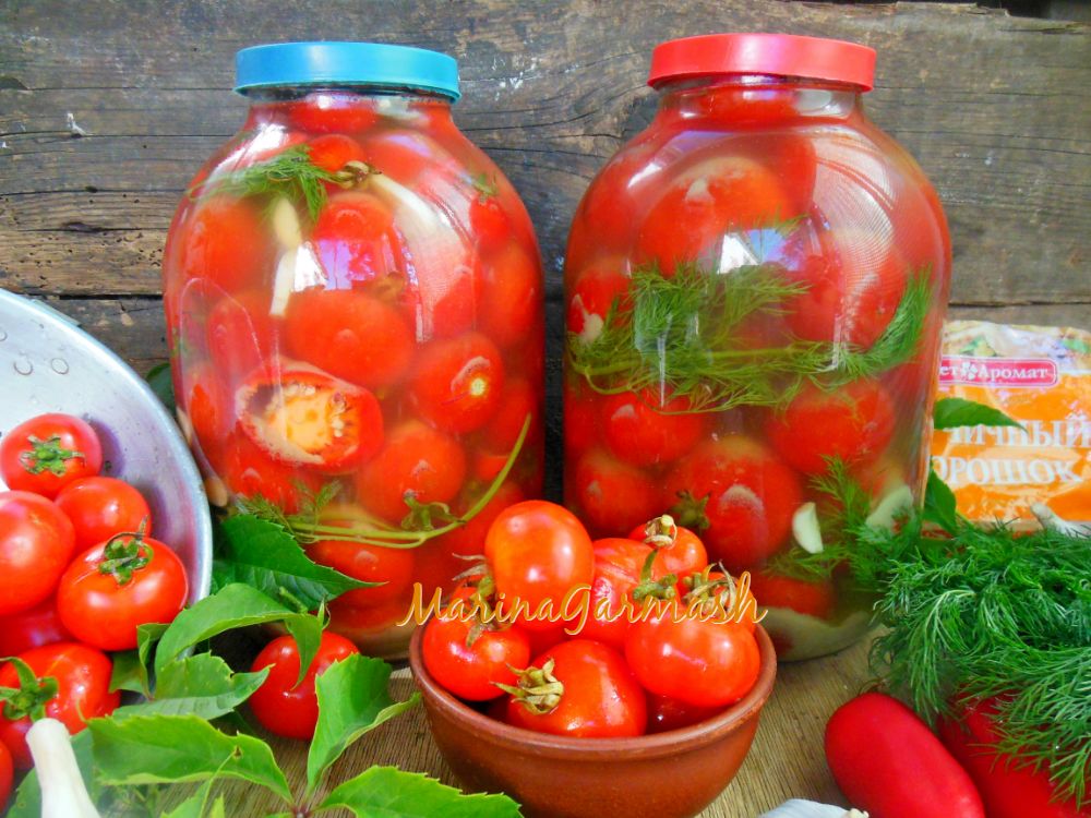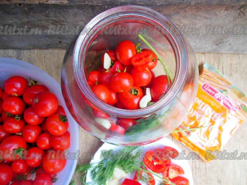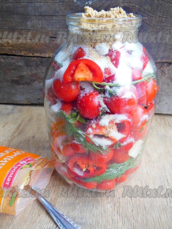 В чистую банку, чередуя с помидорами, положите колечки сладкого перца, чеснок и укроп.