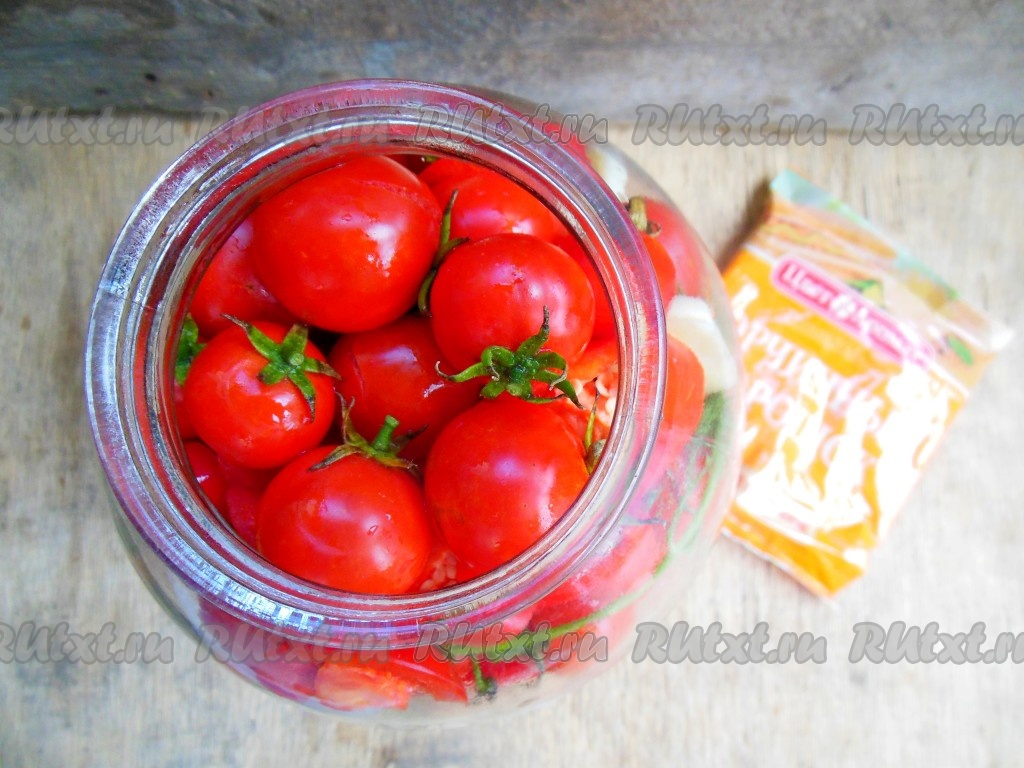 Наполните банку помидорами до самого горлышка, слишком плотно не утрамбовывайте.