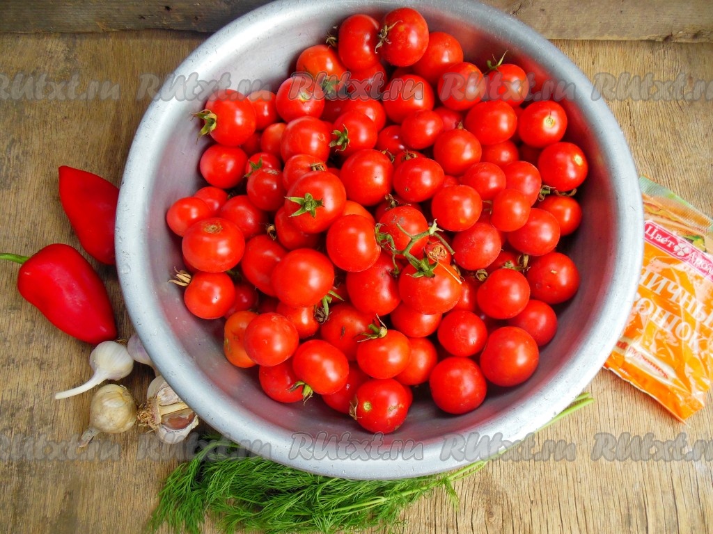 Помидоры промойте под проточной водой. Хвостики удалите (я всегда оставляю хвостики, с ними помидоры эффектно смотрятся на тарелке). Сладкий перец, не очищая от семян, нарежьте колечками, чеснок очистите и нарежьте на пластины, укроп промойте.
