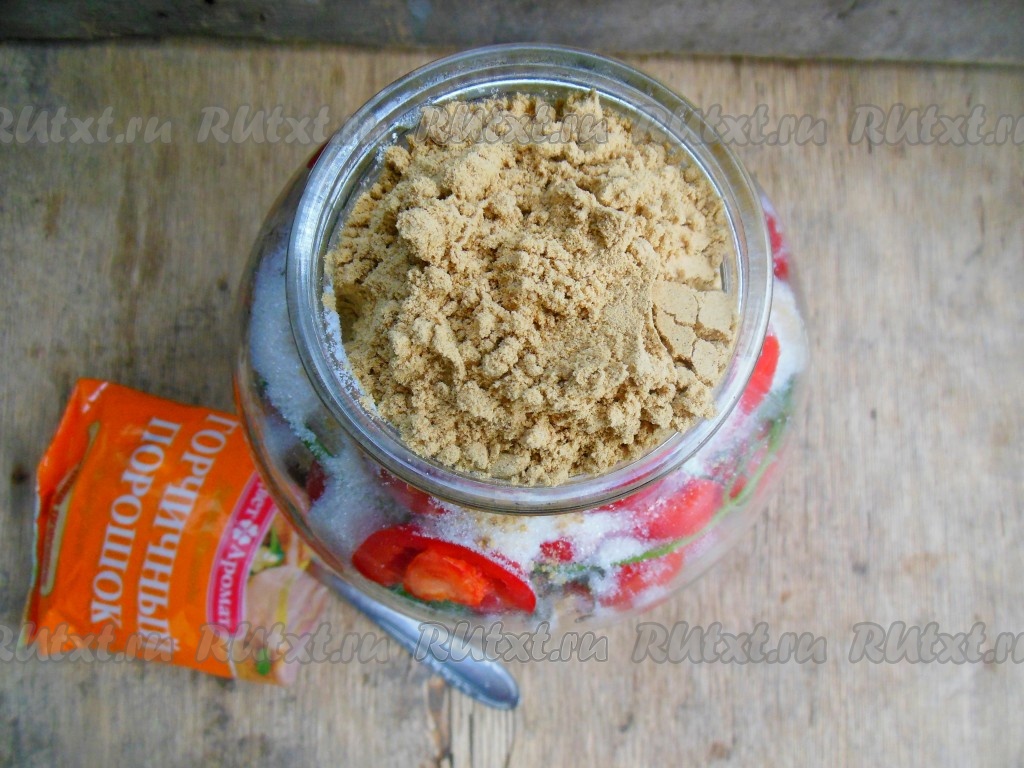 Сверху положите в банку сахар, соль и горчичный порошок.