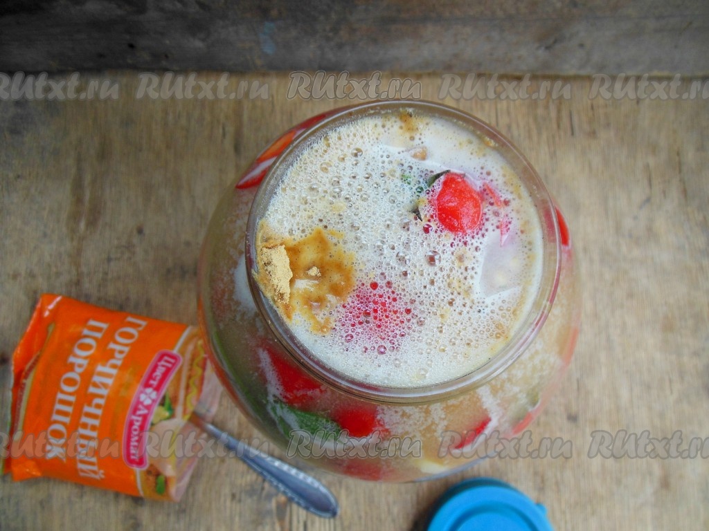 Уберите банку с помидорами в холодильник (или погреб). Я сразу опускаю в погреб. В течение первых суток рассол в помидорах будет мутным, затем горчица осядет вниз и рассол станет светлее. На фото три банки через сутки и одна в первые сутки приготовления.
