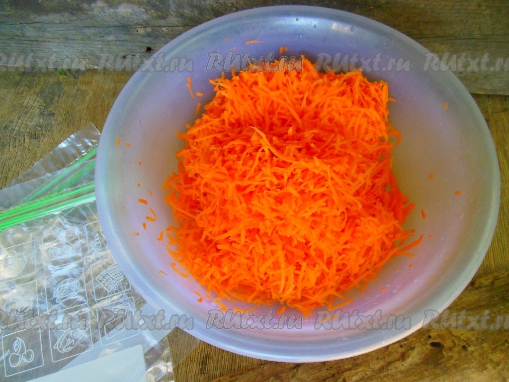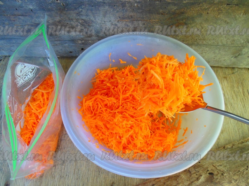 Переложите натертую морковь в пакеты для заморозки (или обычные целлофановые пакеты).
