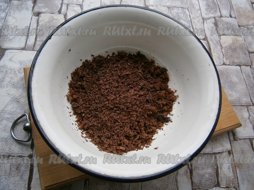 Обрезанные края коржей измельчить в чаше блендера до крошки (не слишком мелкой). К крошке добавить натертый на крупной терке черный шоколад, перемешать.