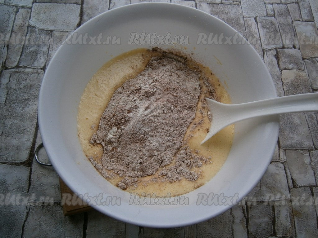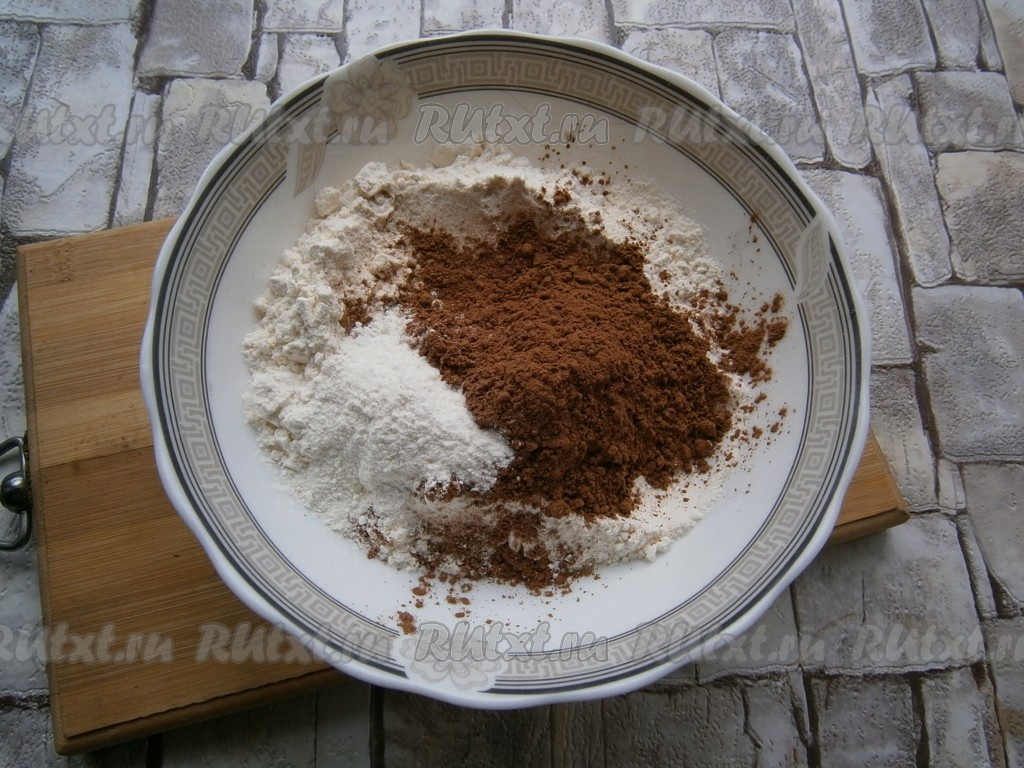 Отдельно смешать муку с разрыхлителем и просеянным через ситечко какао-порошком.
