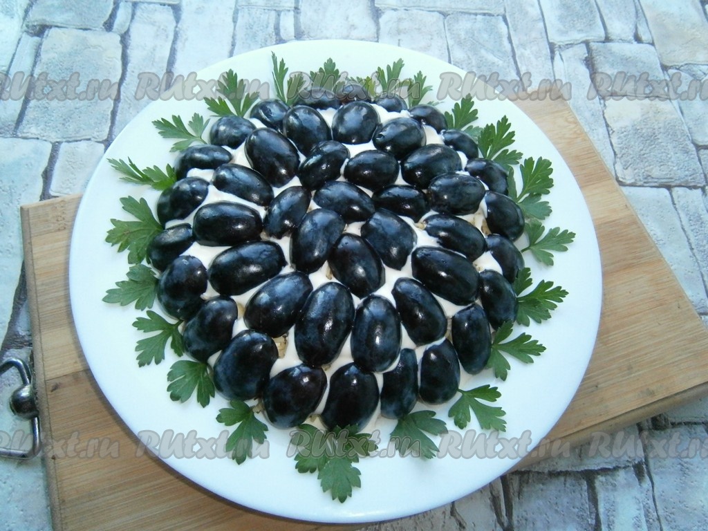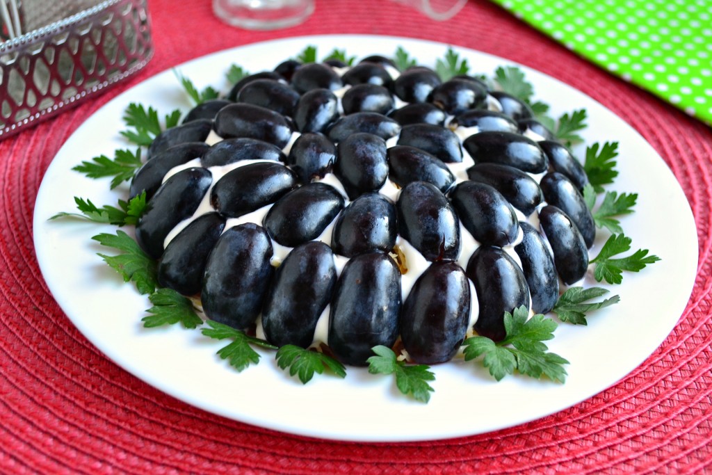 Предлагаю вам рецепт очень вкусного, нарядного, простого в приготовлении салата "Тиффани" с виноградом и грецкими орехами. Несмотря на то, что состав блюда может различаться, оформление остается неизменным - сверху салат украшается половинками любого винограда: зеленого, красного или черного. Виноград имитирует драгоценные камни: зеленый - изумруды или сапфиры, красный - рубины, а черный - опал или обсидиан. Я украсила салат черным виноградом, получилось очень эффектно. Попробуйте, этот салатик украсит любой праздничный стол и обязательно понравится вам и вашим гостям.