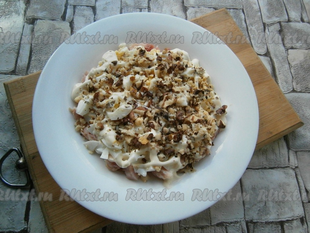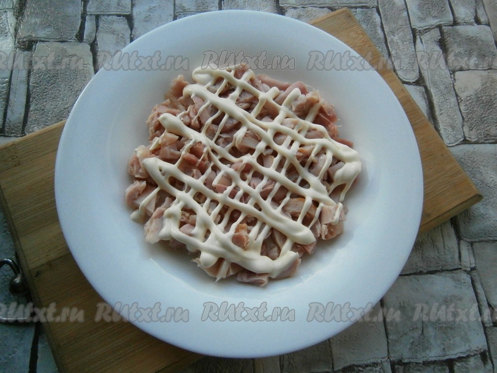 Копченый окорочок освободить от шкуры и костей, мясо нарезать кусочками и выложить на тарелку или в салатник первым слоем. Сверху нанести сеточку из майонеза.