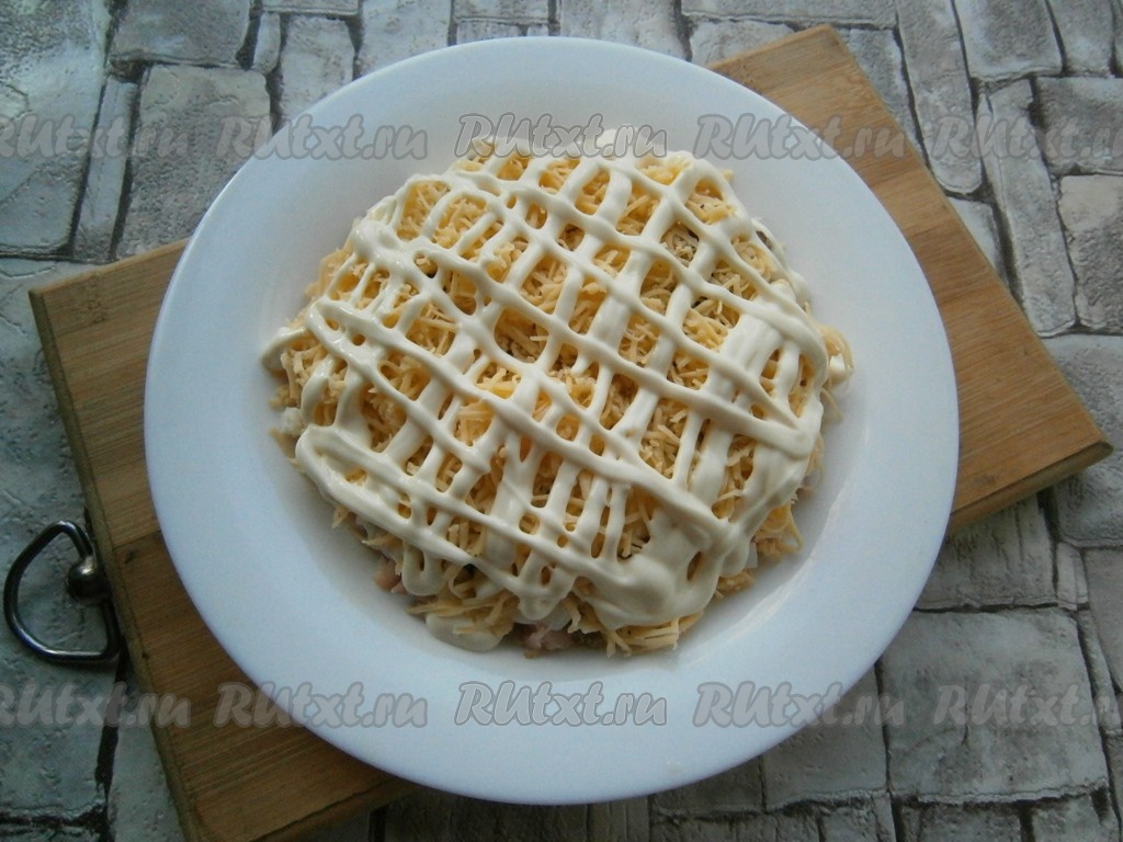 На орехи выложить слой натертого на крупной или средней терке сыра (лучше выбирать сыр не пресный). Также на сыр нанести сетку из майонеза. По желанию, слои салата можно повторить, увеличив количество продуктов.