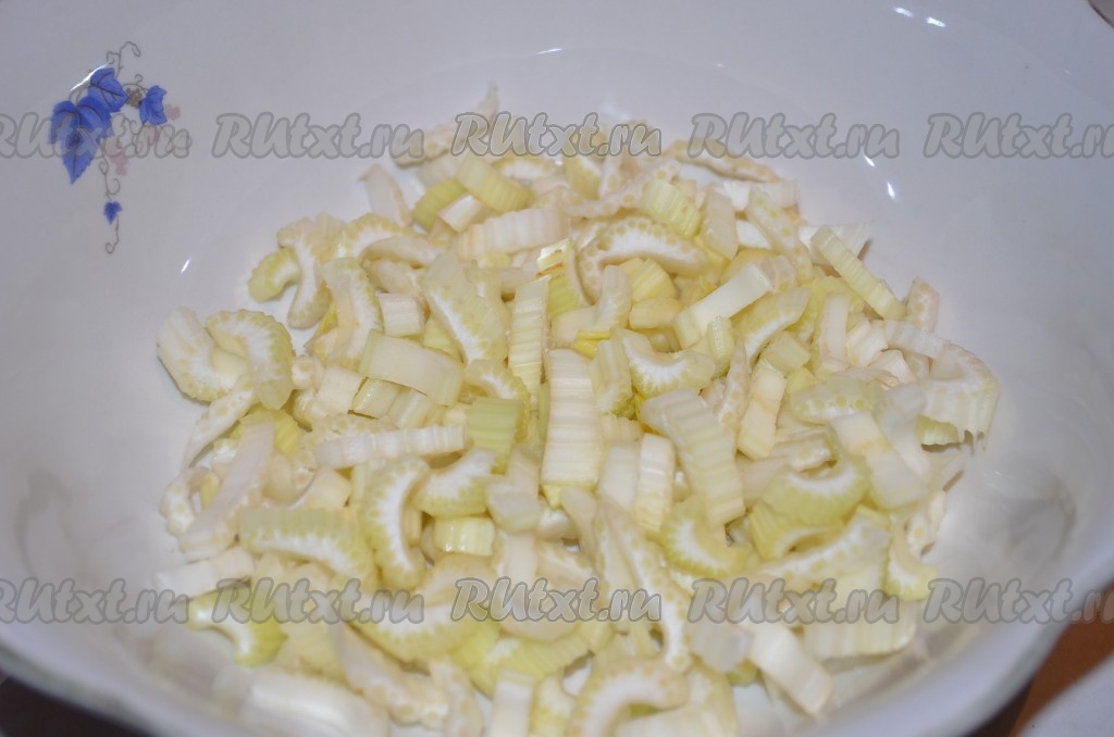 Стебли сельдерея порезать тонкими ломтиками.