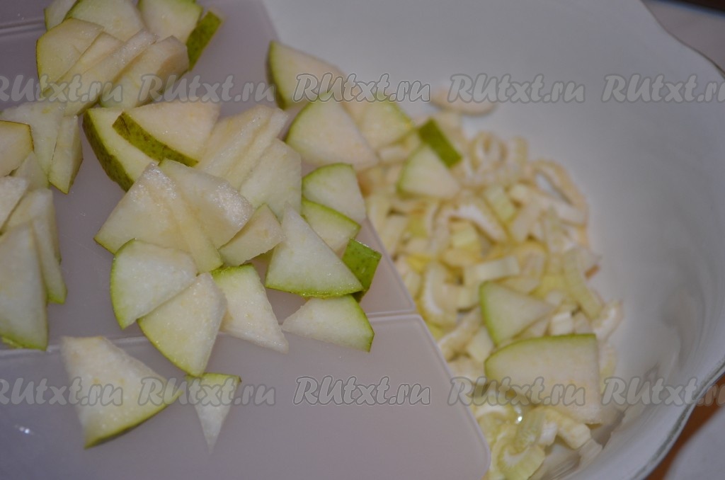 Грушу порезать произвольно и отправить к сельдерею.