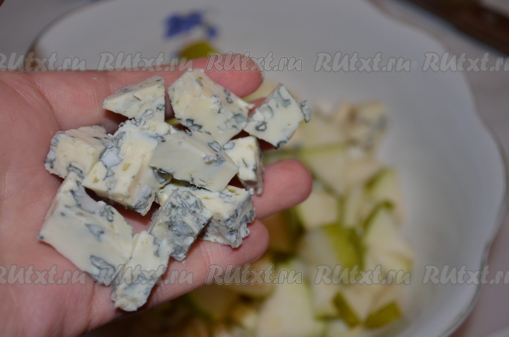 Добавить сыр с голубой плесенью, порезанный кусочками, в салат к сельдерею и груше.