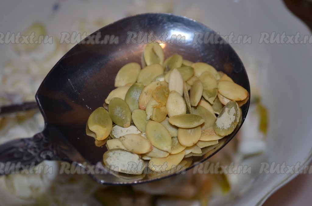 Тыквенные семечки обжарить, добавить в салатник.