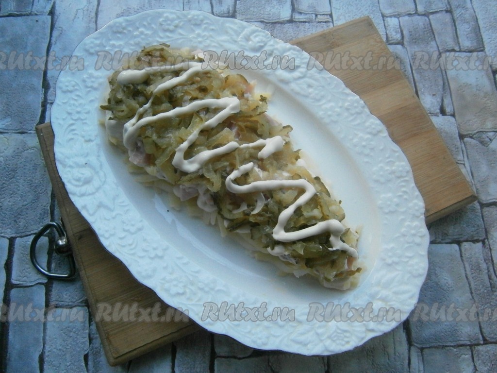 Следующим слоем выложить натертый на крупной терке и отжатый маринованный или соленый огурчик + майонез.