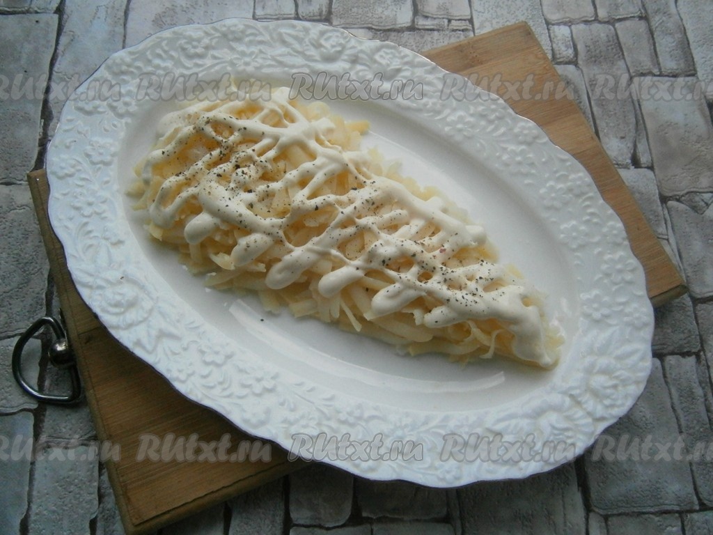На овальную или прямоугольную тарелку выложить очищенный и натертый на крупной или средней терке картофель в виде грозди винограда. Слой картофеля немного посолить и поперчить, нанести сеточку из майонеза.