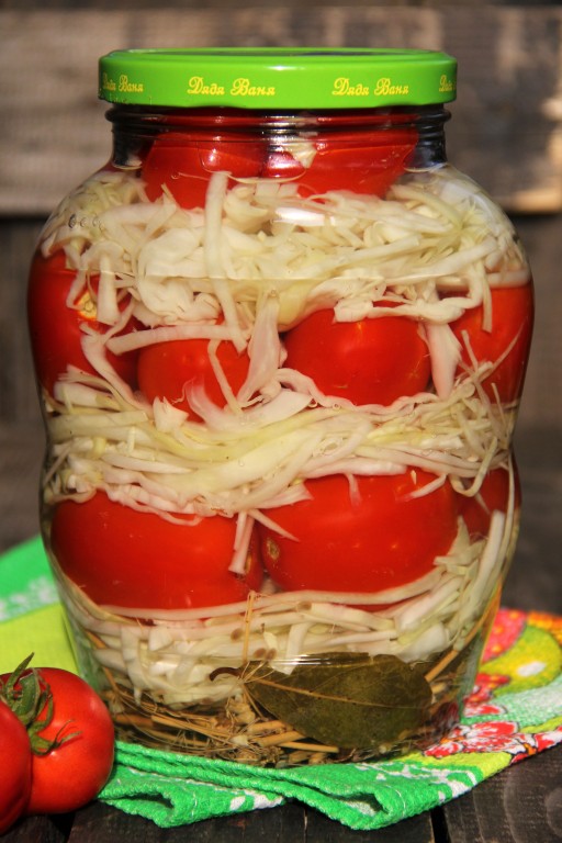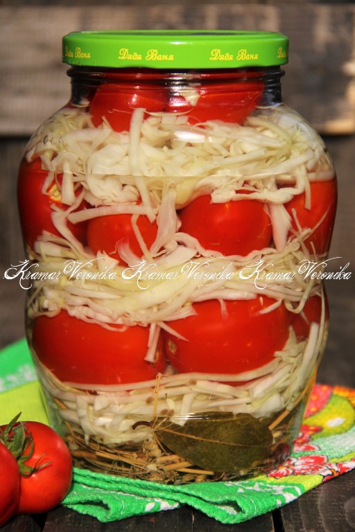 Залить горячим маринадом до самого верха банки с капустой и помидорами, закрутить крышками, перевернуть вверх дном, укутать в одеяло до полного остывания, а затем убрать на хранение в кладовку или погреб.