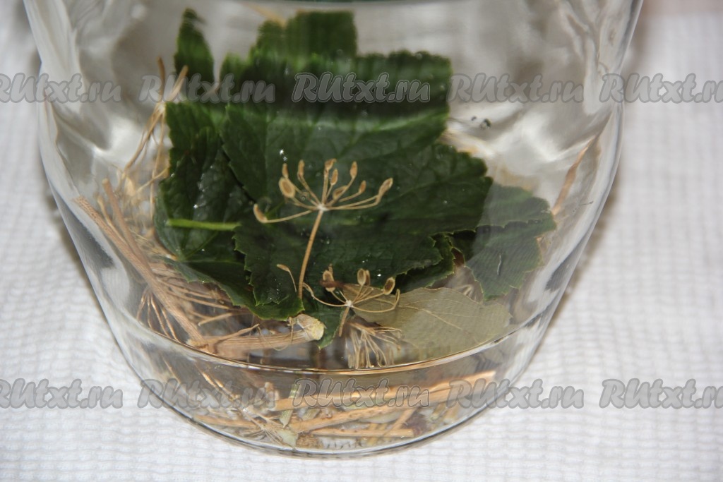 Банки предварительно простерилизовать. На дно каждой двухлитровой банки выложить 2 листика смородины, 1 зонтик укропа (у меня сушеный укроп), 2 зубчика чеснока, 7-10 горошин чёрного перца, 2-3 горошины душистого перца, 2-3 лавровых листика.