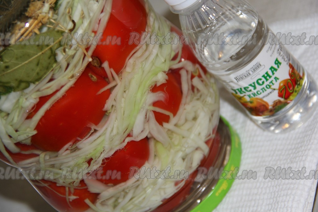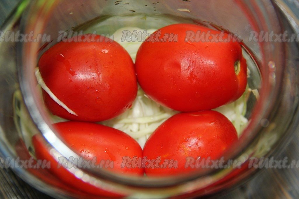 Помидоры вымыть. На капусту выложить слой помидоров (у меня влезло 4 штучки).
