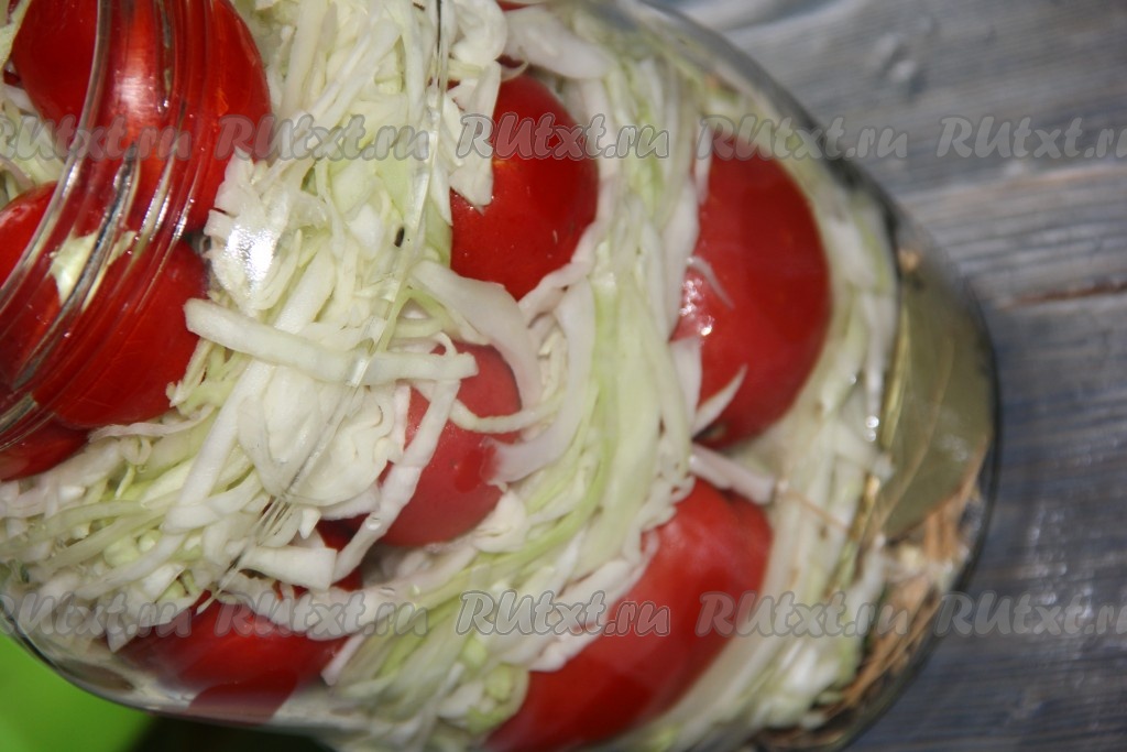 Таким образом, чередуя слои капусты и помидоров, заполнить баночки до самого горлышка. Сверху должен быть слой помидоров.