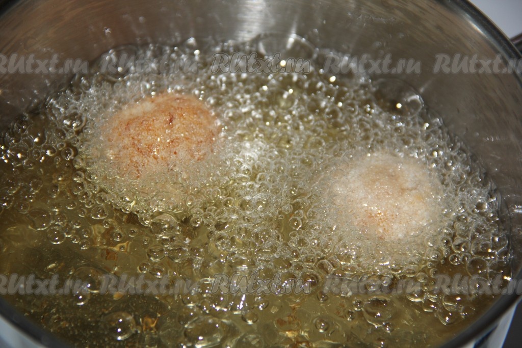 Масло хорошо разогреть (масла должно быть достаточно много). Аккуратно выложить сырные шарики с ветчиной в масло и жарить на среднем огне до золотистого цвета.