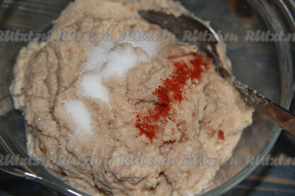 Выложить получившуюся массу в миску, добавить соль. Я для вкуса добавила 1/2 чайной ложки паприки. Тщательно перемешать массу, она получится в меру густой.