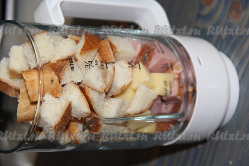 Выложить ветчину, сыр и хлеб в чашу блендера.