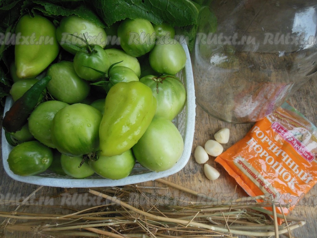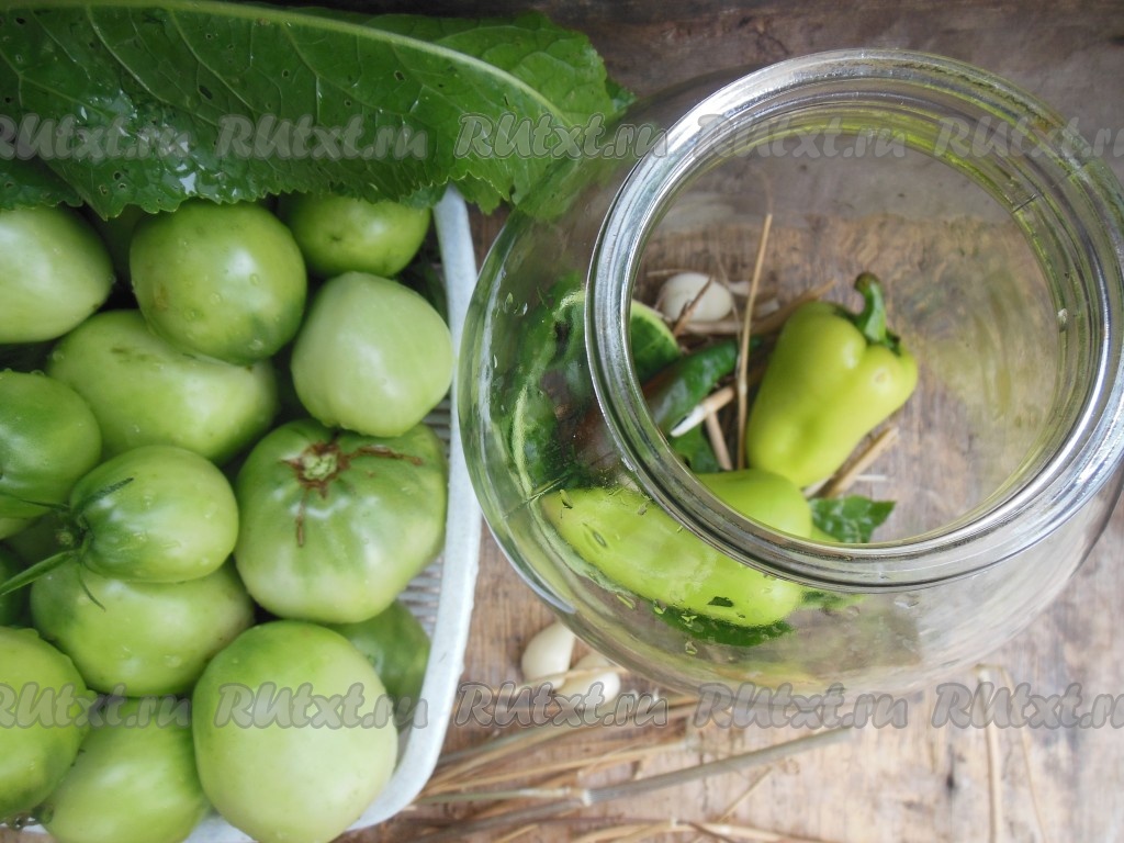 Зеленые помидоры промойте под проточной водой. Приготовьте солевой раствор, добавив в 2 литра холодной воды 1 столовую ложку соли, залейте помидоры на 1 час. Пару раз солевой раствор можно сменить. Таким образом в зеленых помидорах мы уберем соланин и помидорчики не будут горчить. Переложите помидоры на дуршлаг, чтобы стекла жидкость. Промойте листья хрена, сладкий и острый перцы, очистите чеснок.