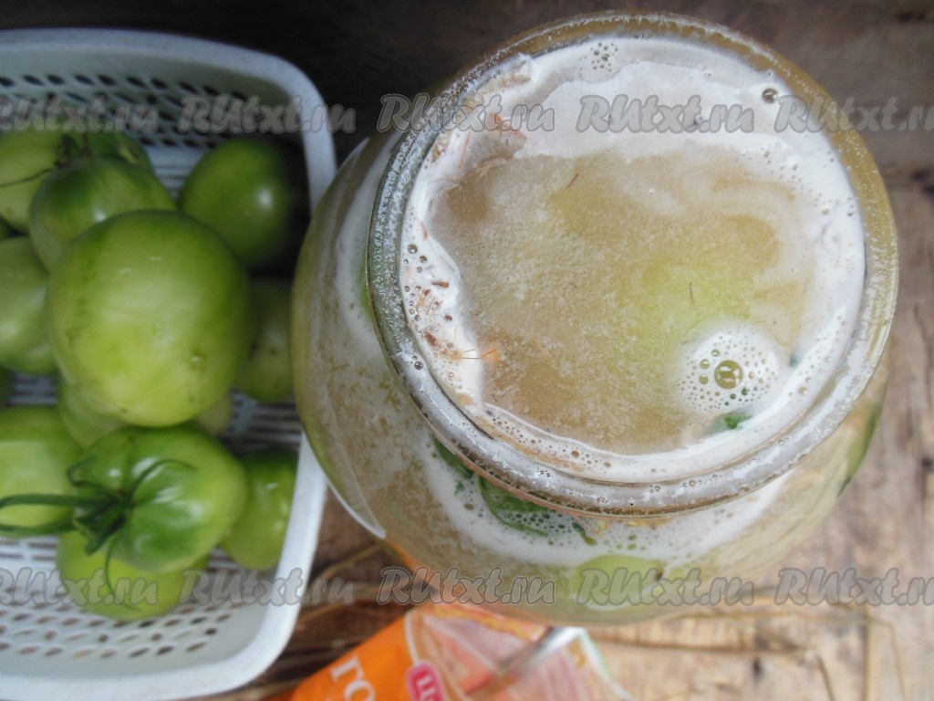 Наполните банку зелеными помидорами до самого горлышка. Сверху положите листочек хрена.