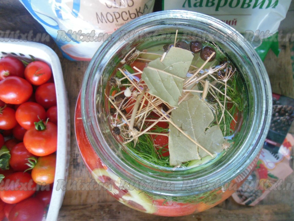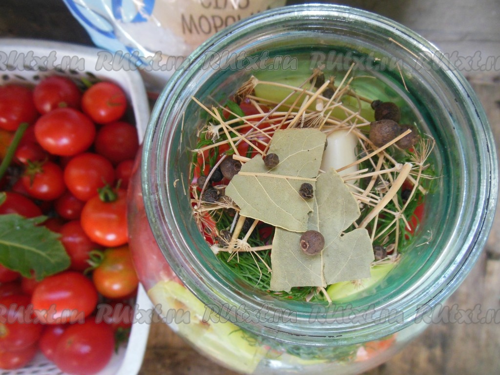 Добавьте в банку лавровый лист, горошины душистого и чёрного перцев.