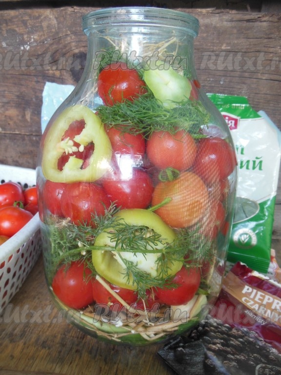 Заполните банку до самого верха помидорами, чередуя их с колечками сладкого перца и веточками зелёного укропа.