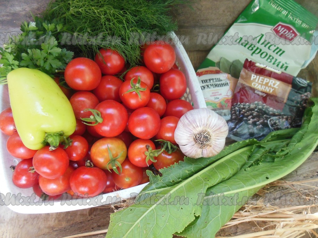 Помидоры промойте под проточной водой, по желанию, удалите чашелистики. Промойте листья хрена, очистите чеснок. Сладкий перец, не очищая от семян, нарежьте колечками.