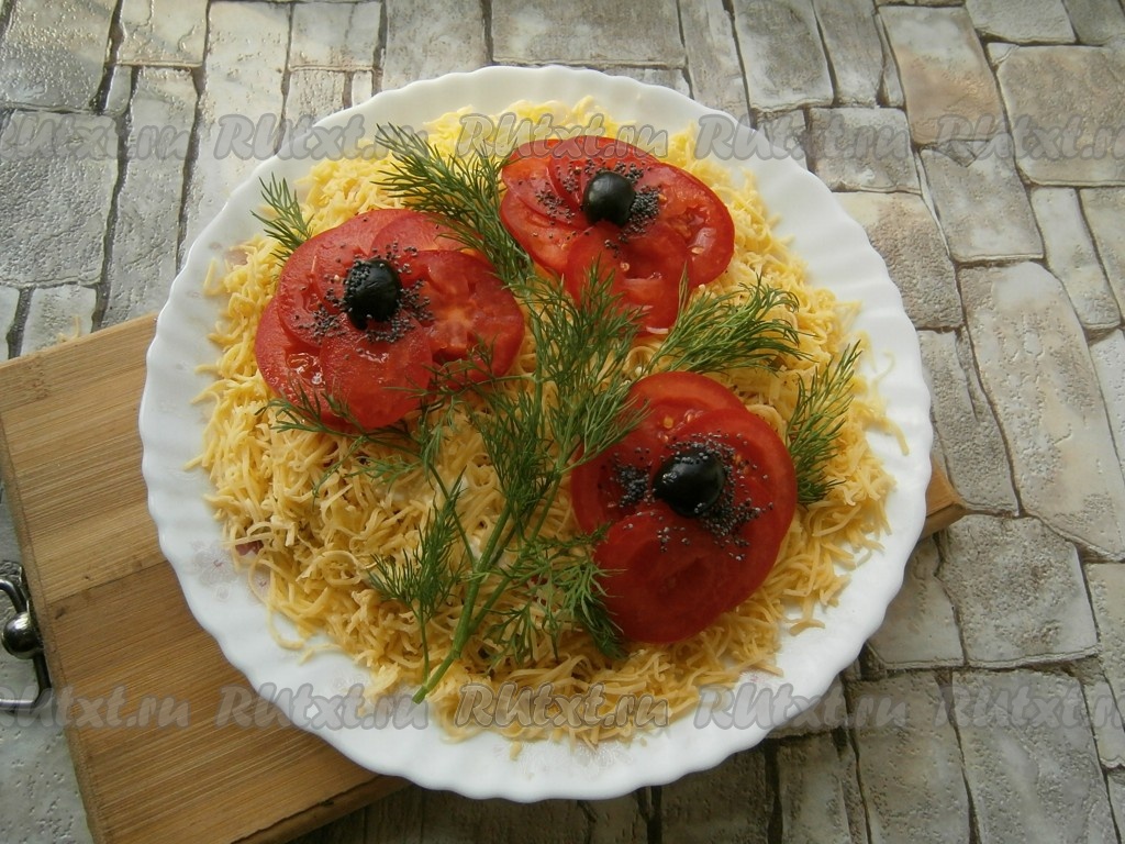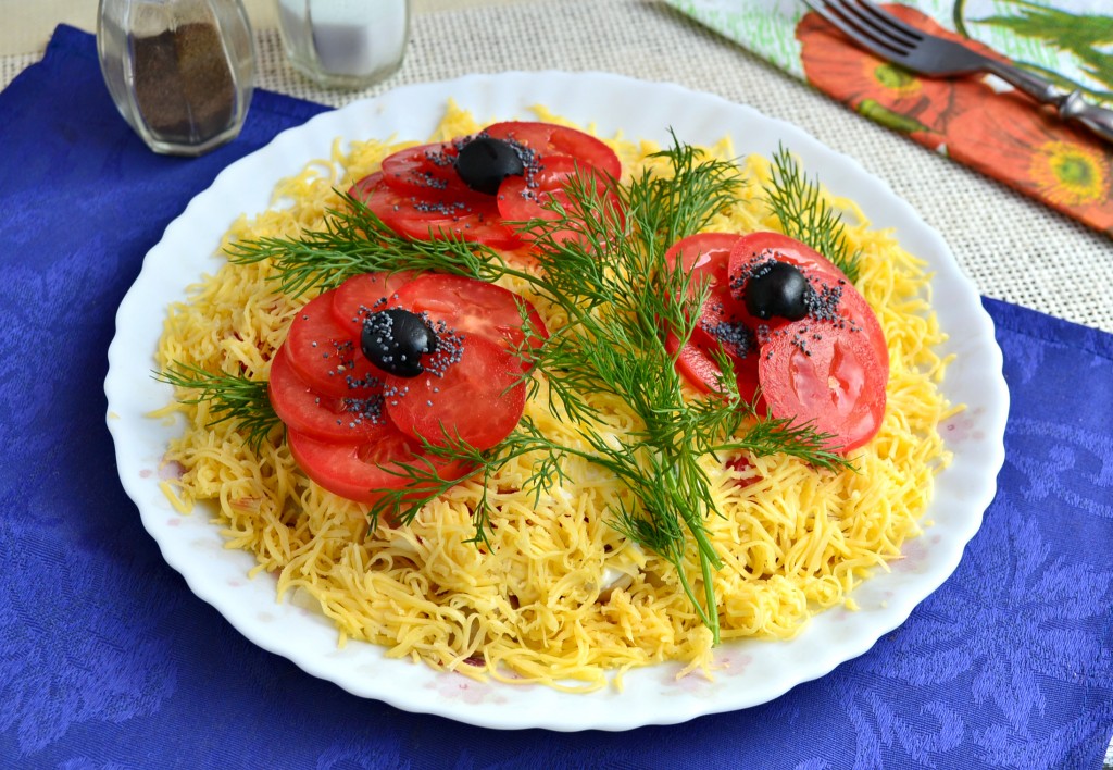 Оставшиеся помидоры нарезать тонкими кружочками и выложить их в виде цветков на салат. В центр каждого мака поместить по половинке или целой оливке, немного посыпать вокруг нее маком. Веточками укропа будут имитировать листья и стебли цветов.