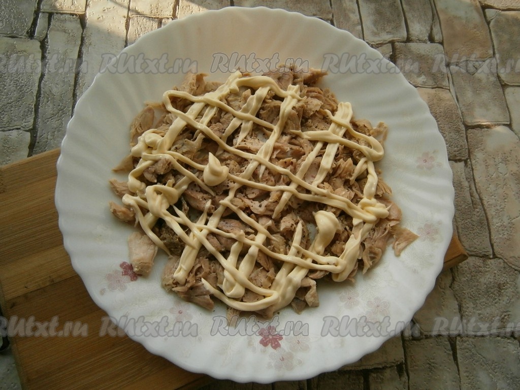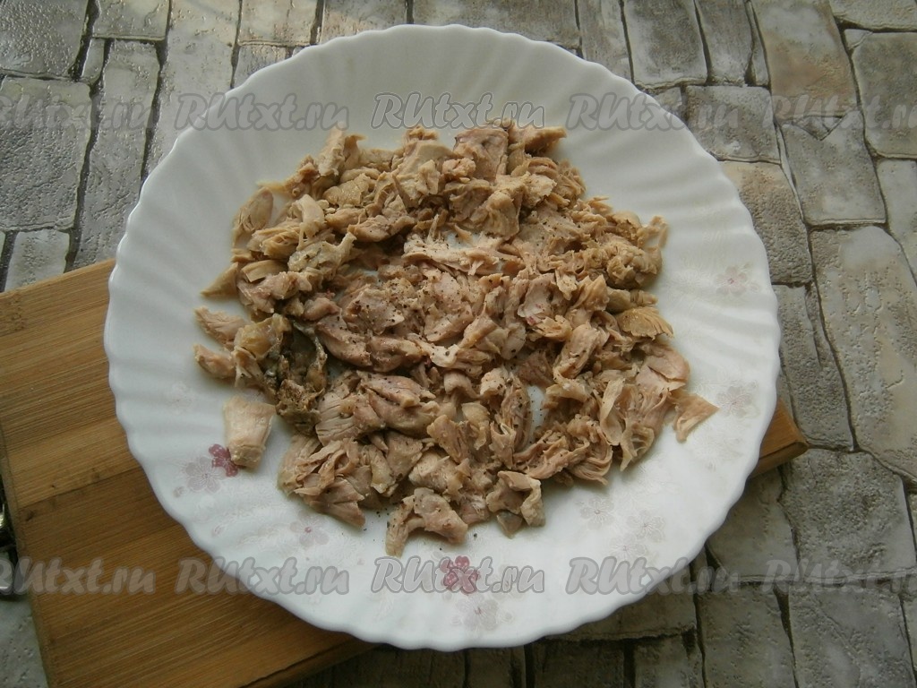 Мясо курицы предварительно отварить в подсоленной воде в течение 40-45 минут, остудить. Порвать мясо на волокна и выложить первым слоем на тарелку, немного его поперчить.