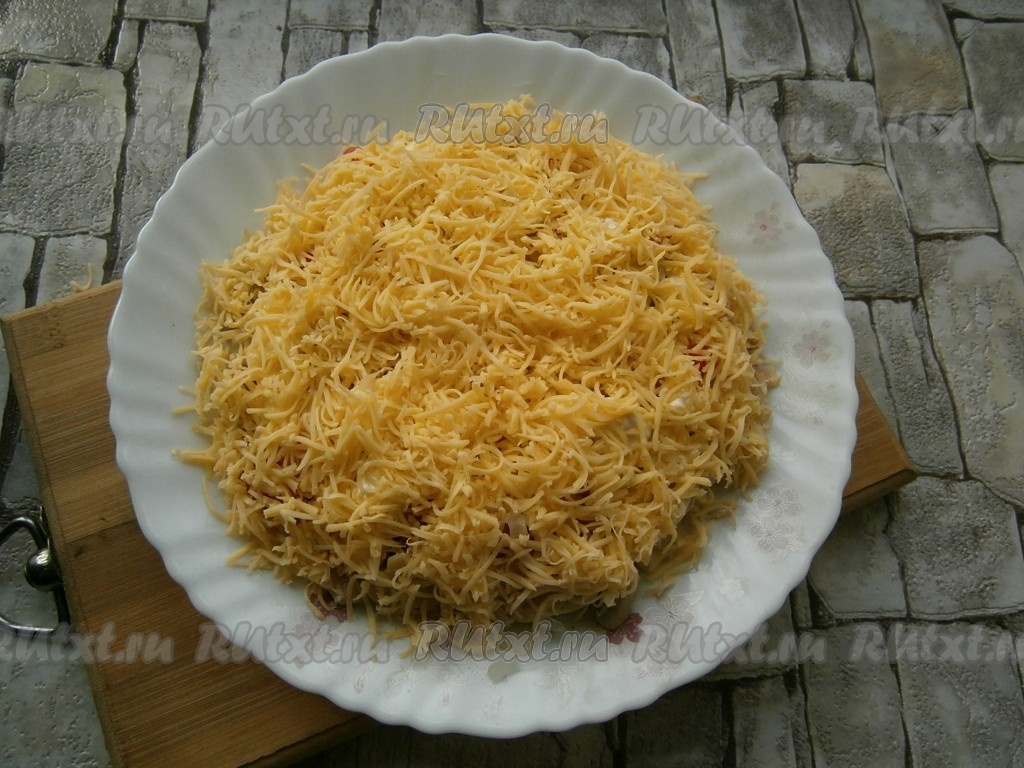 Последним слоем выложить натертый на средней терке твердый сыр. Сыром покрыть и бока салата. Майонезом не смазывать.