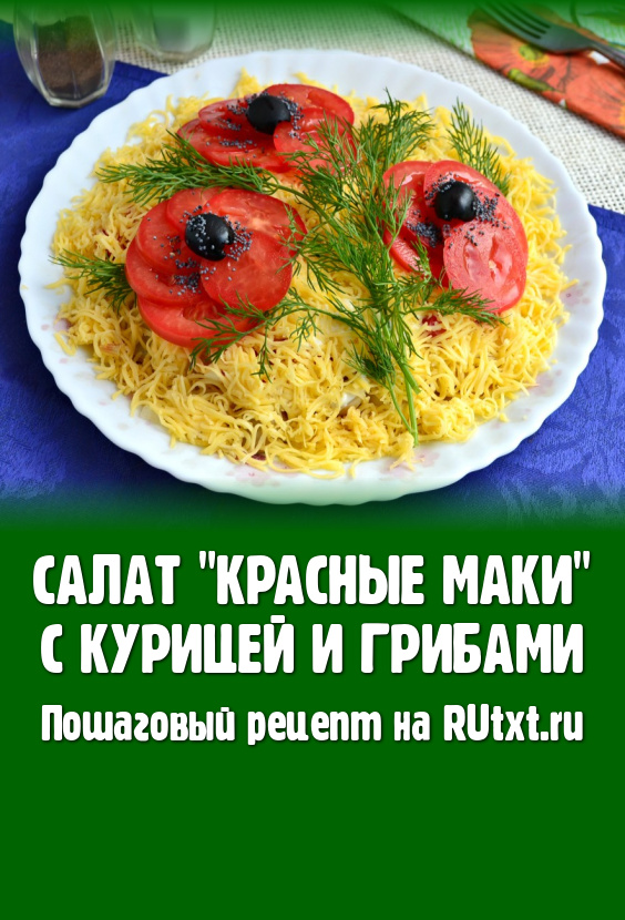 Предлагаю вам приготовить к любому праздничному застолью красивый и эффектный салат "Красные маки" с курицей и грибами. Салатик прост по своему составу, но получается очень вкусным. Украшен салат сверху маками, которые придают блюду яркий и нарядный вид. Куриное мясо можно использовать любое - как филе, так и обрезанное с ножек или бедрышек. Чтобы салат приобрел свой неповторимый вкус, он должен пропитаться 30-40 минут в прохладном месте.