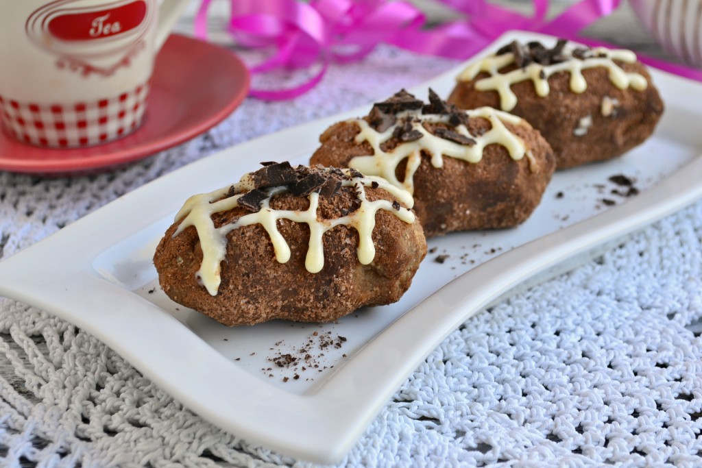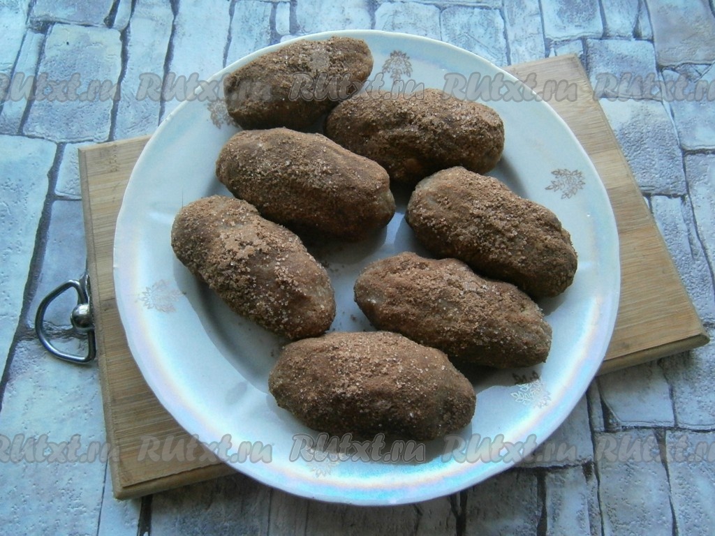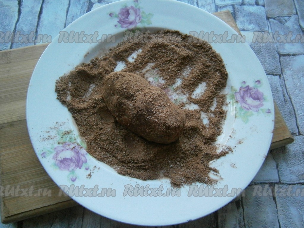 Затем руками слепить из подготовленной массы небольшие овальные пирожные "Картошка" и обвалять их в приготовленной смеси какао и сахара.