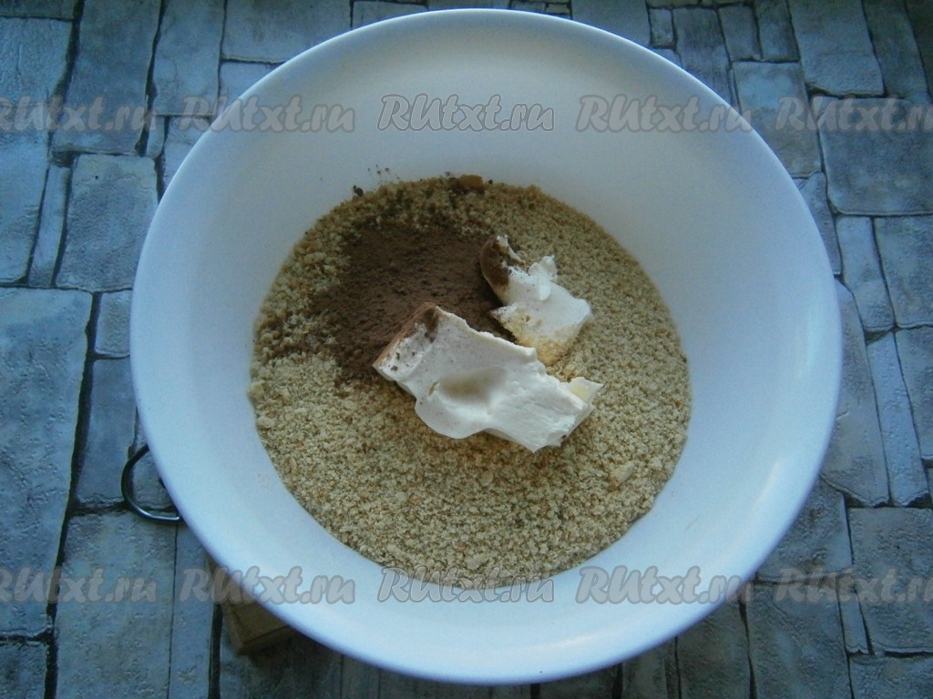 Пересыпать крошку в миску, добавить размягченное сливочное масло и какао-порошок.