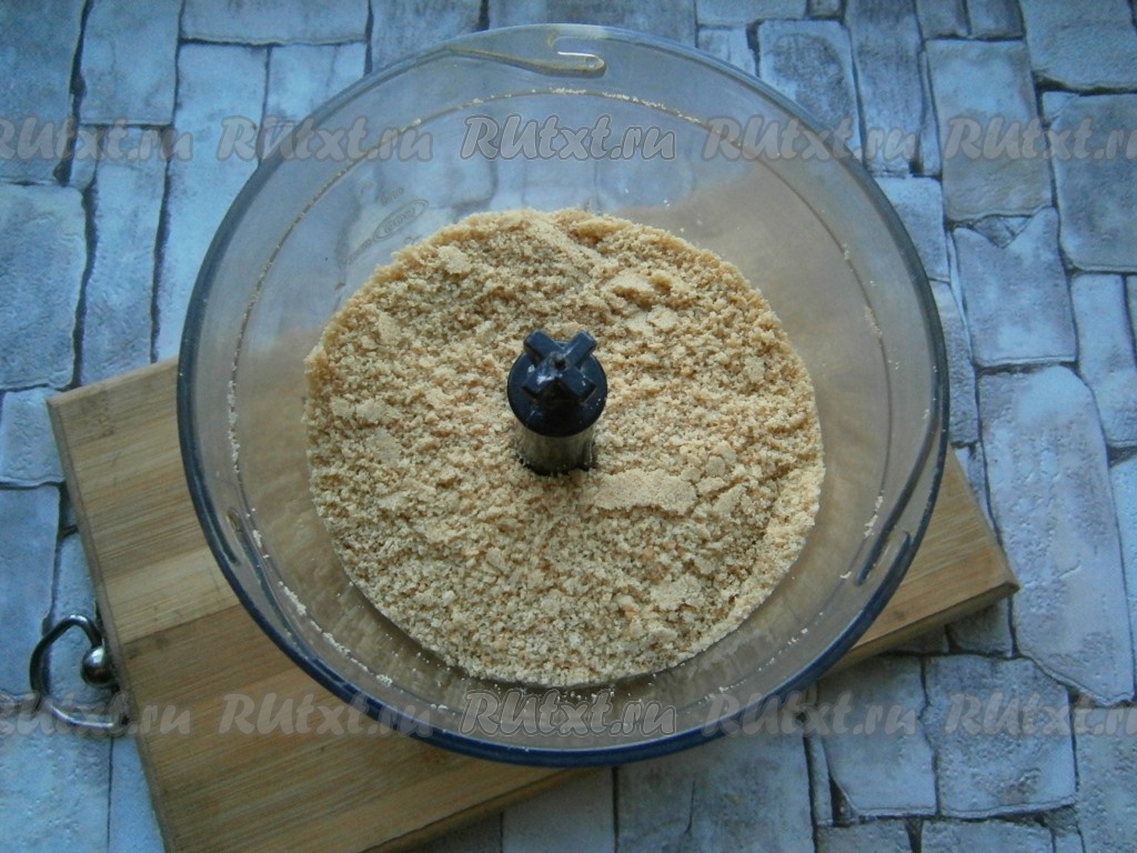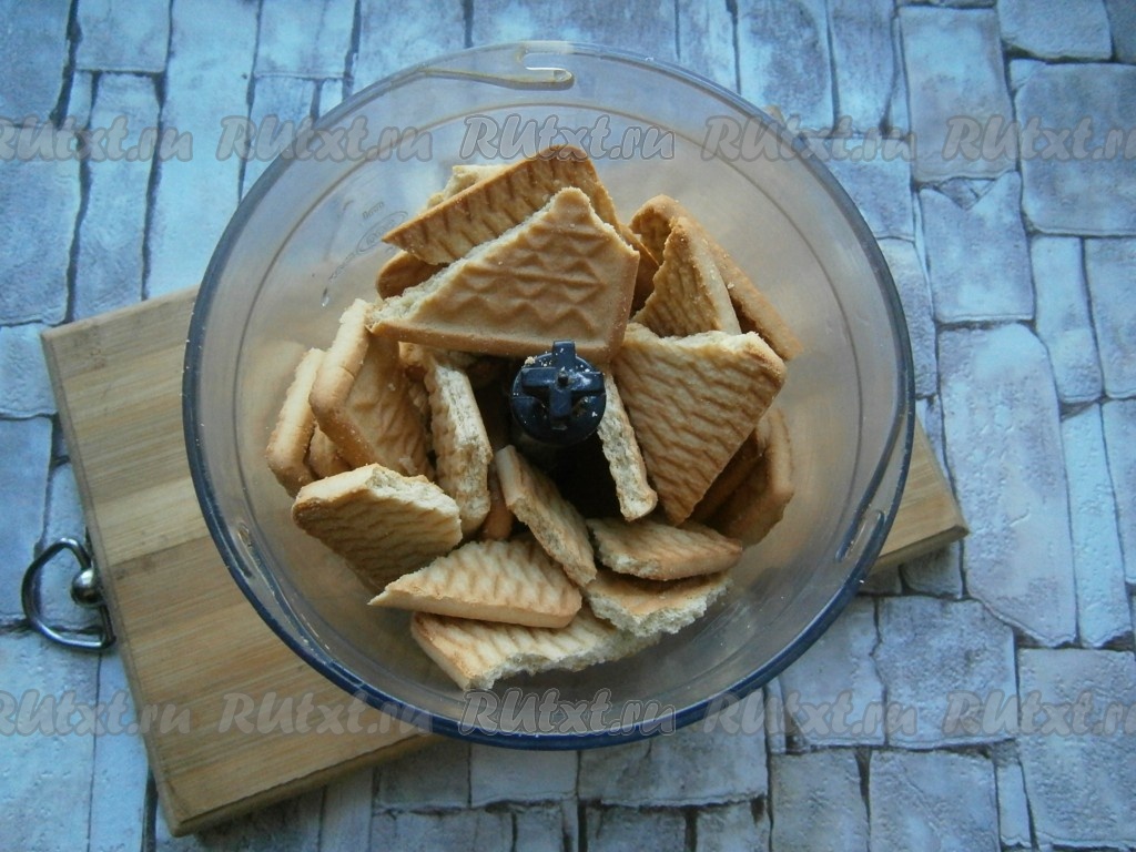 Печенье измельчить до состояния крошки. Если нет блендера, можно сложить печенье в целлофановый пакет и растолочь его при помощи скалки.